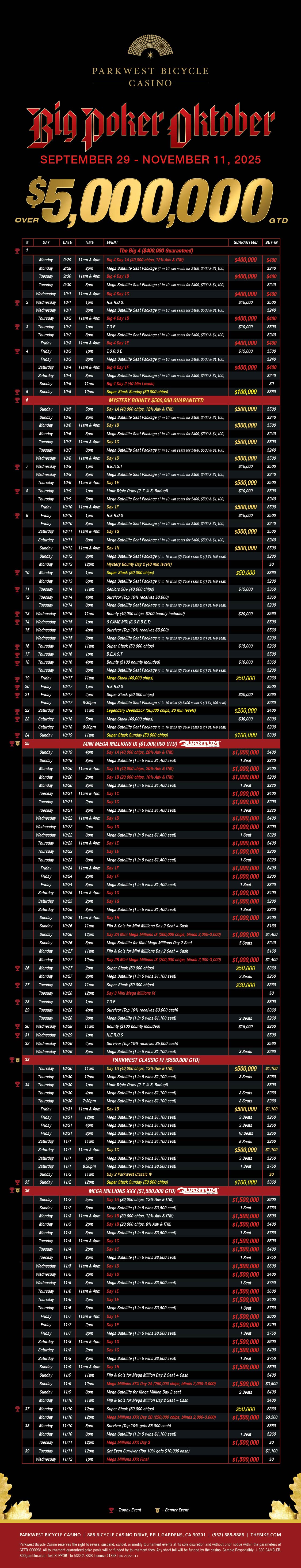 | 25 | Saturday, October 25, 2025 | 2PM | MINI MEGA MILLIONS IX - 1MIL GTD | $200 | Structures | Results |